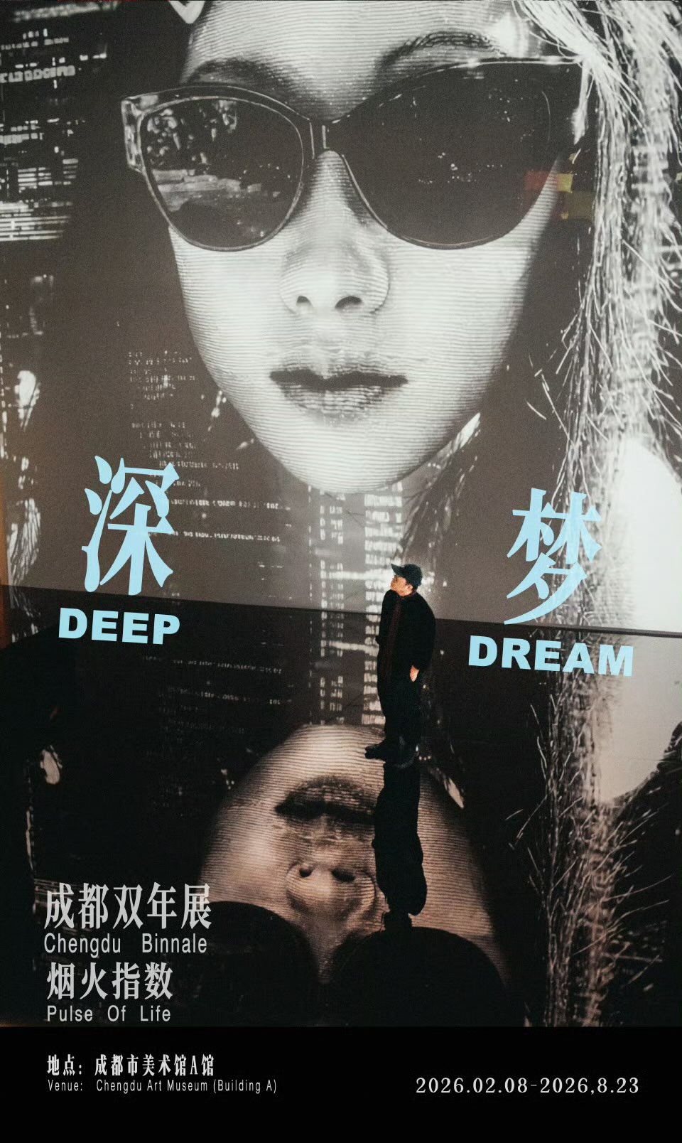 《深梦》呈现了一个奇特的场景:静态的巨大Lili坐在玻璃舞台之上,背后利用AI技术生成的“动态”Lili正在展示她的生活碎片,电影语言、数字技术与艺术现场在这里交织,带来极致的虚幻和极致的真实。步入《深梦》,总让人联想起《庄子·齐物论》:“不知周之梦为胡蝶与,胡蝶之梦为周与?”