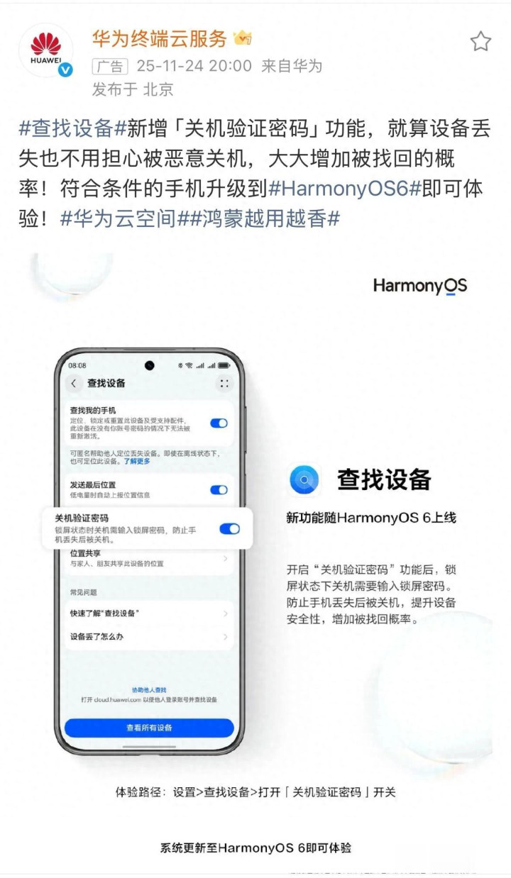 用户体验上,华为将这一功能集成在易于找到的位置。用户可以进入手机“设置”菜单,选择“查找设备”选项,即可看到“关机验证密码”的开关。
